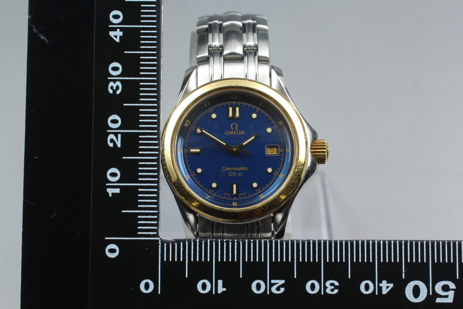 Near MINT OH OMEGA Seamaster 120m Blue 18K Gold 18KYG Quartz 30mm Ladies Watch #16582